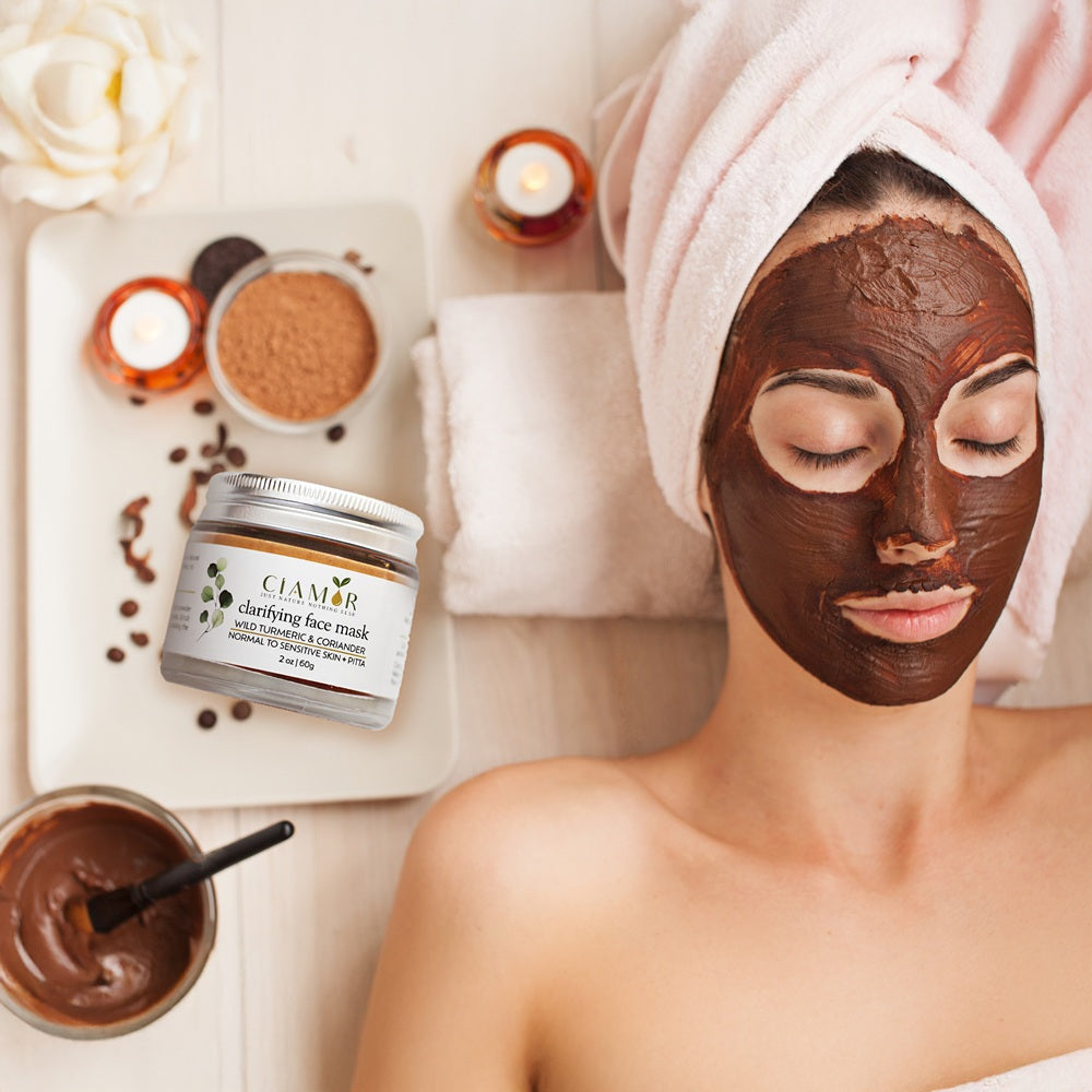 Apply the Clarifying face mask once a week to support detox and calm inflamed areas.